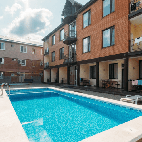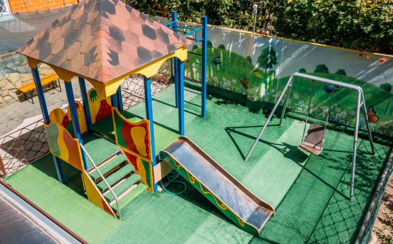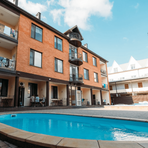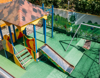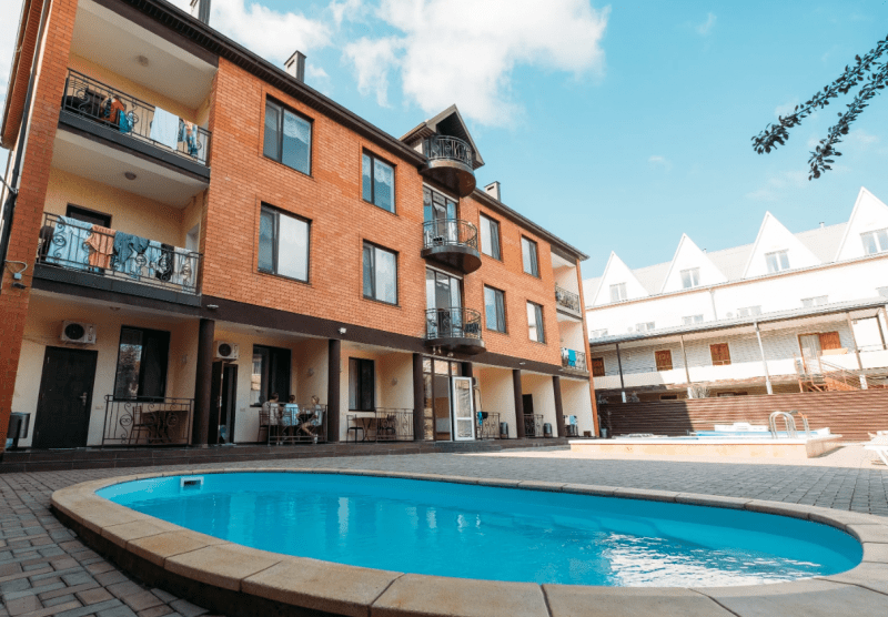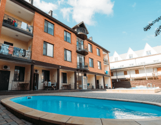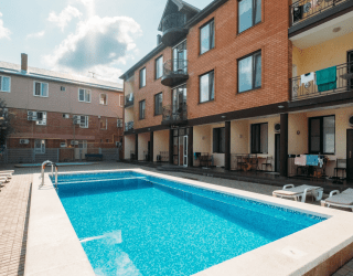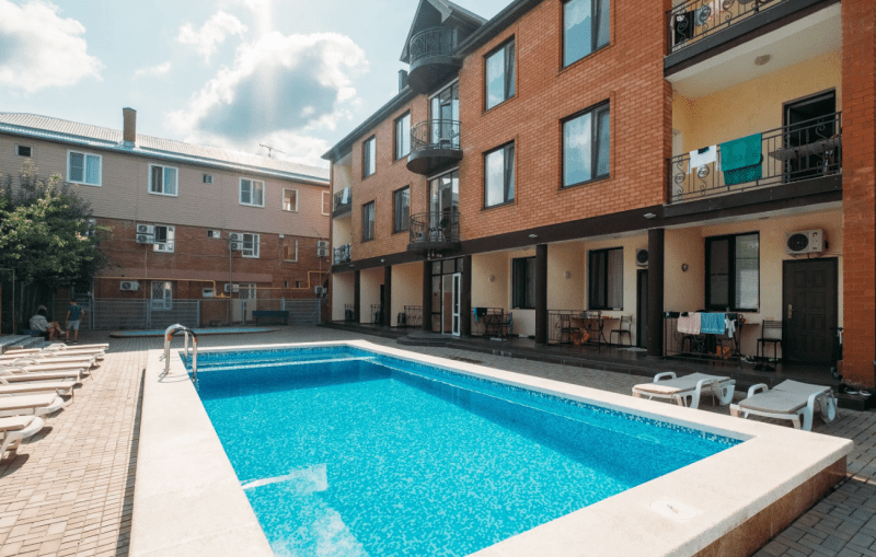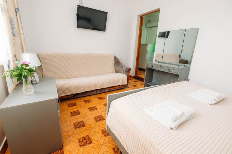 На территории есть просторный благоустроенный дворик, а также детский и взрослый бассейны. Для маленьких гостей на детской площадке каждый день работает аниматор. До оборудованного городского пляжа – 10 минут езды.